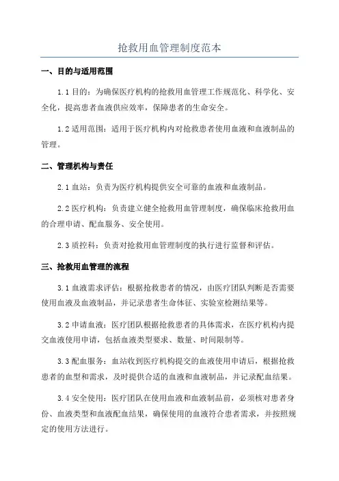 抢救用血管理制度模版一、目的和适用范围本制度旨在规范抢救用血的管理流程,确保抢救用血的安全性和有效性。
