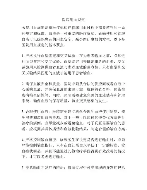二、用血管理的基本原则1. 安全原则:医院在用血过程中,必须确保用血的安全性,避免交叉感染和其他血液传播疾病的发生。