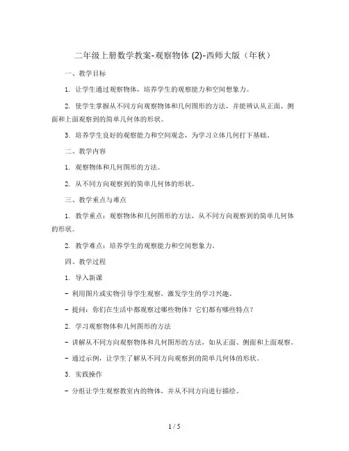 二年级上册数学教案-观察物体 (2)-西师大版(年秋)一、教学目标1. 让学生通过观察物体,培养学生的观察能力和空间想象力。