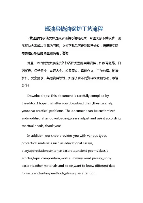 文档下载后可定制随意修改,请根据实际需要进行相应的调整和使用,谢谢!并且,本店铺为大家提供各种各样类型的实用资料,如教育随笔、日记赏析、句子摘抄、古诗大全、经典美文、话题作文、工作总结、词语解析、文案摘录、其他资料等等,如想了解不同资料格式和写法,敬请关注!Download tips: This document is carefully compiled by theeditor. I hope that after you download them,they can help yousolve practical problems. The document can be customized andmodified after downloading,please adjust and use it according toactual needs, thank you!In addition, our shop provides you with various types ofpractical materials,such as educational essays, diaryappreciation,sentence excerpts,ancient poems,classic articles,topic composition,work summary,word parsing,copy excerpts,other materials and so on,want to know different data formats andwriting methods,please pay attention!燃油导热油锅炉工艺流程一、准备工作阶段。