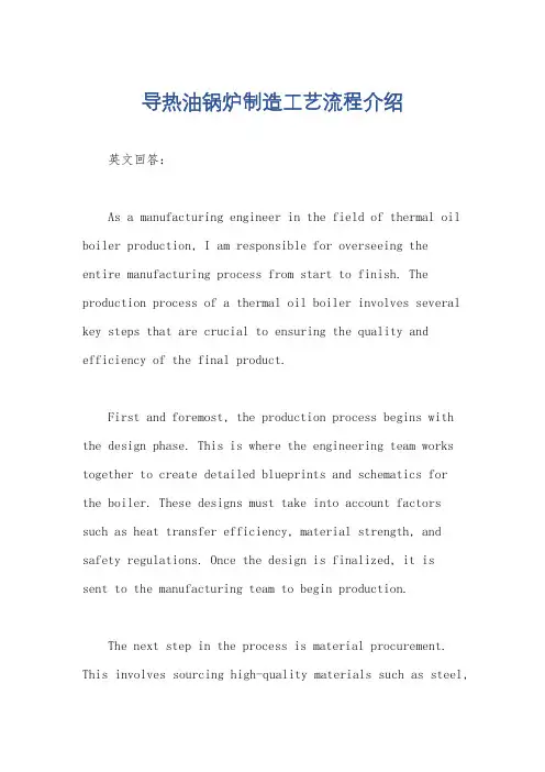 导热油锅炉制造工艺流程介绍英文回答:As a manufacturing engineer in the field of thermal oil boiler production, I am responsible for overseeing theentire manufacturing process from start to finish. The production process of a thermal oil boiler involves several key steps that are crucial to ensuring the quality and efficiency of the final product.First and foremost, the production process begins with the design phase. This is where the engineering team works together to create detailed blueprints and schematics forthe boiler. These designs must take into account factors such as heat transfer efficiency, material strength, and safety regulations. Once the design is finalized, it issent to the manufacturing team to begin production.The next step in the process is material procurement. This involves sourcing high-quality materials such as steel,copper, and insulation materials that will be used in the construction of the boiler. It is important to work with reputable suppliers to ensure that the materials meet the necessary specifications and standards.After the materials have been procured, the manufacturing team can begin the fabrication process. This involves cutting, welding, and assembling the various components of the boiler according to the design specifications. Precision and attention to detail are crucial during this stage to ensure that the boiler functions properly and safely.Once the boiler has been fabricated, it undergoes rigorous testing to ensure that it meets all quality and safety standards. This may involve pressure testing, leak testing, and performance testing to verify that the boiler operates efficiently and reliably.After the testing phase is complete and any necessary adjustments have been made, the boiler is ready for final assembly and packaging. This involves installing anyremaining components, such as control systems and insulation, before the boiler is packaged and prepared for shipment to the customer.In conclusion, the manufacturing process of a thermaloil boiler is a complex and intricate process that requires careful planning, attention to detail, and collaboration between various teams. By following a systematic approach and adhering to strict quality standards, we can ensurethat the final product meets the needs and expectations of our customers.中文回答:作为导热油锅炉生产领域的制造工程师,我负责监督整个生产过程,从开始到结束。