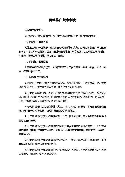 网络推广规章制度网络推广规章制度为了规范公司的网络推广行为,维护公司的良好形象,制定本规章制度。