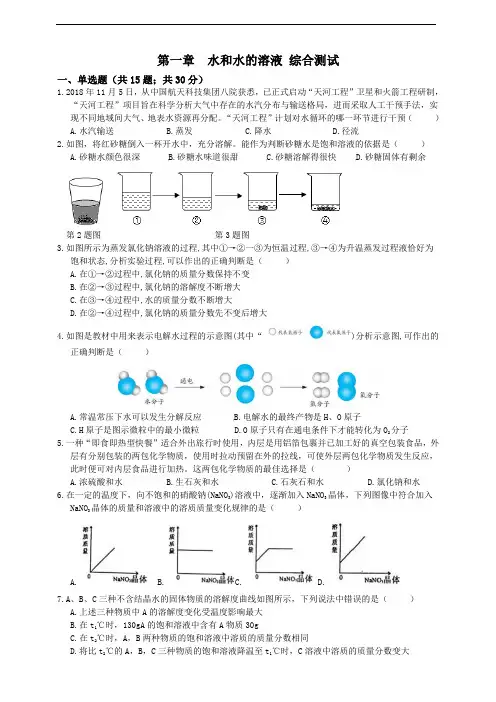 第一章水和水的溶液综合测试一、单选题(共15题;共30分)1.2018年11月5日,从中国航天科技集团八院获悉,已正式启动“天河工程”卫星和火箭工程研制,“天河工程”项目旨在科学分析大气中存在的水汽分布与输送格局,进而采取人工干预手法,实现不同地域间大气、地表水资源再分配。