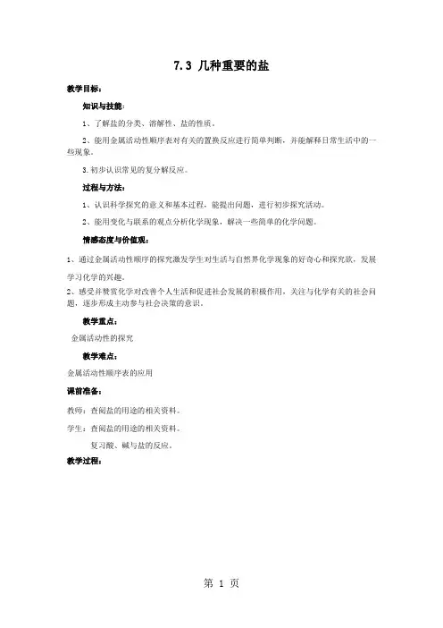 教学重点:金属活动性的探究教学难点:金属活动性顺序表的应用课前准备:教师:查阅盐的用途的相关资料。