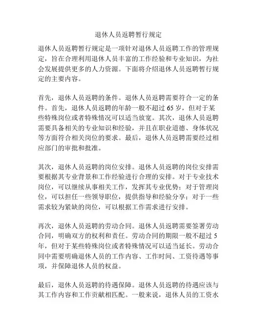 总之,退休人员返聘暂行规定是为了更好地利用退休人员的工作经验和专业知识,提供更多的人力资源支持。