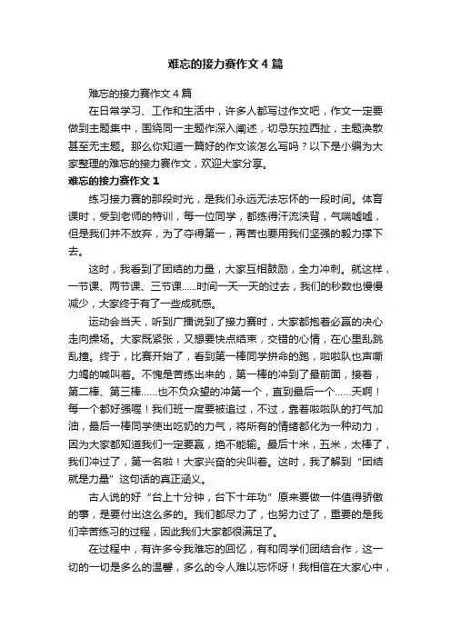 文档下载后可定制修改,请根据实际需要进行调整和使用,谢谢!并且,本店铺为大家提供各种类型的经典范文,如总结计划、党团报告、合同协议、策划方案、演讲致辞、规章制度、条据文书、教学资料、作文大全、其他范文等等,想了解不同范文格式和写法,敬请关注!Download tips: This document is carefully compiled by this editor. I hope that after you download it, it can help you solve practical problems. The document can be customized and modified after downloading, please adjust and use it according to actual needs, thank you!Moreover, our store provides various types of classic sample essays, such as summary plans, party and youth league reports, contract agreements, planning plans, speeches, rules and regulations, doctrinal documents, teaching materials, complete essays, and other sample essays. If you would like to learn about different sample formats and writing methods, please stay tuned!接力赛的作文500字10篇接力赛跑属于田径运动的一类,为多人合作的径赛项目。