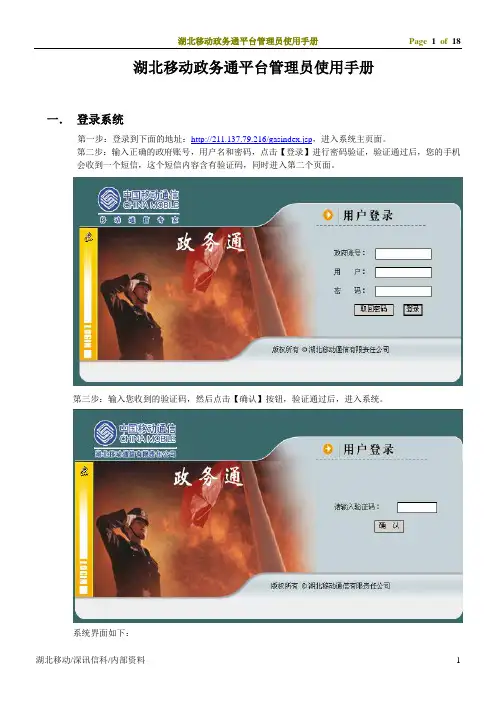 湖北移动政务通平台管理员使用手册一.登录系统第一步:登录到下面的地址:http://211.137.79.216/gasindex.jsp,进入系统主页面。