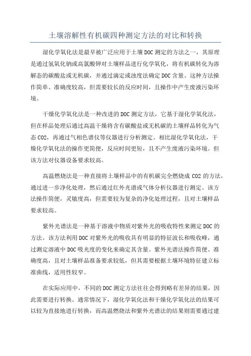 土壤溶解性有机碳四种测定方法的对比和转换土壤溶解性有机碳(SoilDissolvedOrganicCarbon,简称SDOC)是土壤中的一种重要的有机物质,是土壤中养分、有益微生物与其环境、生物活性之间的重要连接部分。