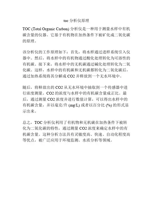 二、有机碳测定方法1.燃烧氧化-非分散红外法(Combustion Oxidation-Non-Dispersive Infrared,CO-NDIR)CO-NDIR法是测定溶解有机碳(DOC)的常用方法。