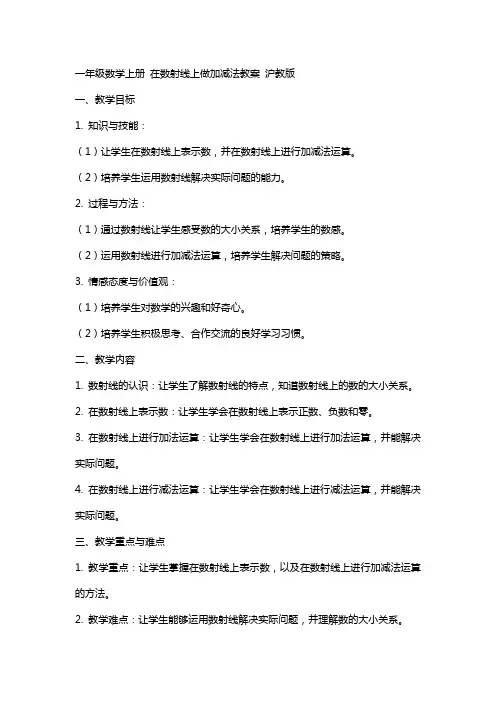 一年级数学上册在数射线上做加减法教案沪教版教学目标:1. 知识与技能:学生能够在数射线上进行加减法运算,理解数射线加减法的意义。