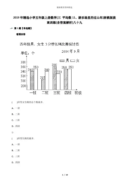 2019年精选小学五年级上册数学[三平均数11、游乐场里的过山车]浙教版拔高训练[含答案解析]八十九第1题【单选题】看图回答( )班男女生跳的总个数最多.A、一班B、二班C、三班D、四班( )班男生跳的最多.A、一班B、二班C、三班D、四班( )班女生跳的最少.A、一班B、二班C、三班D、四班四个班男生平均跳约( )个(结果取整数).A、340B、341C、345男生跳的最多的比最少的多( )个.A、30B、10C、45D、55【答案】:【解析】:第2题【单选题】甲、乙、丙三数的平均数是87,甲、乙两数的和为126,丙数为( )。