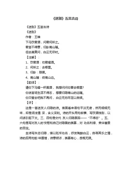 离别古诗王维《送别》赏析《送别》是唐代诗人王维创作的一首五言古诗。