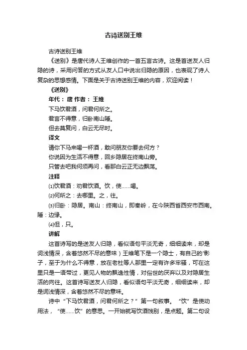 古诗送别王维古诗送别王维《送别》是唐代诗人王维创作的一首五言古诗。