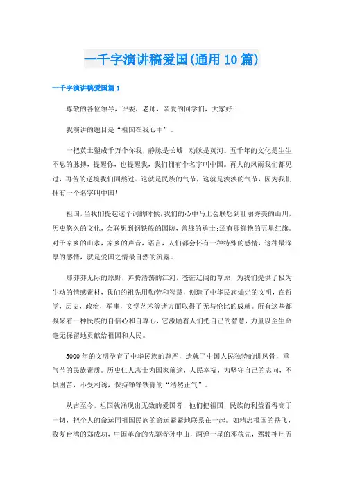 热爱祖国一千字演讲稿(最新3篇)热爱祖国一千字演讲稿篇一老师们,同学们,大家好!我的题目是热爱祖国,振兴中华。
