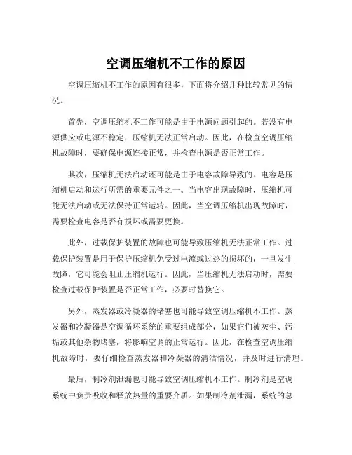 5. 压缩机故障:最后,空调压缩机不工作的一个常见原因是压缩机本身出现故障。