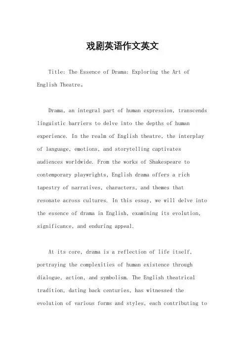 戏剧英语作文英文Title: The Essence of Drama: Exploring the Art of English Theatre。