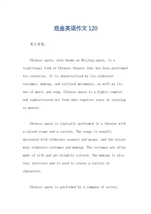 戏曲英语作文120英文回答:Chinese opera, also known as Beijing opera, is a traditional form of Chinese theater that has been performed for centuries. It is characterized by its elaborate costumes, makeup, and stylized movements, as well as its use of music and song. Chinese opera is a highly complex and sophisticated art form that requires years of training to master.Chinese opera is typically performed in a theater with a raised stage and a curtain. The stage is usually decorated with elaborate scenery and props, and the actors wear elaborate costumes and makeup. The costumes are often made of silk and are brightly colored. The makeup is also very intricate and is used to create a variety of characters.Chinese opera is performed by a company of actors,singers, and musicians. The actors are trained in a variety of skills, including singing, dancing, and acrobatics. The singers are also trained in a variety of vocal techniques, and they often use a falsetto voice. The musicians play a variety of instruments, including the pipa, the erhu, and the drums.Chinese opera is a highly stylized form of theater. The actors use a variety of gestures and movements to convey emotion and character. The singing is also very stylized, and the actors often use a nasal voice.Chinese opera is a very popular form of entertainmentin China. It is often performed in theaters and on television. Chinese opera is also a popular form of tourism, and many tourists come to China to see a performance.中文回答:京剧,又称北京戏曲,是中国的一种传统戏剧形式,已有几个世纪的历史。