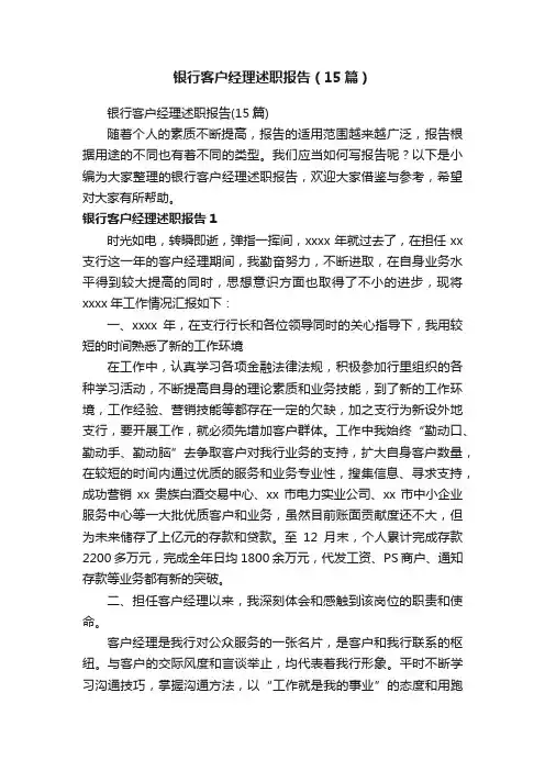 银行客户经理述职报告(15篇)银行客户经理述职报告(15篇)随着个人的素质不断提高,报告的适用范围越来越广泛,报告根据用途的不同也有着不同的类型。