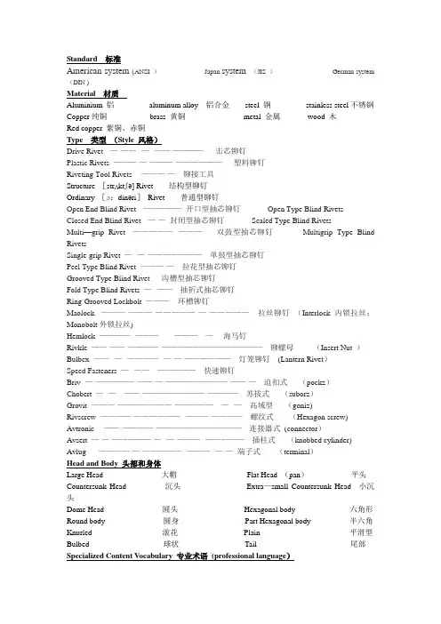 Standard 标准American system (ANSI )Japan system (JIS )German system (DIN )Material 材质Aluminium 铝aluminum alloy 铝合金steel 钢stainless steel不锈钢Copper纯铜brass 黄铜metal 金属wood 木Red copper 紫铜、赤铜Type 类型(Style 风格)Drive Rivet --—-——--—--——-————击芯铆钉Plastic Rivets ———-—-———-——————塑料铆钉Riveting Tool Rivets ---———-—铆接工具Structure [strʌktʃə] Rivet 结构型铆钉Ordinary [ɔ:dinəri]Rivet 普通型铆钉Open End Blind Rivet --—————开口型抽芯铆钉Open Type Blind RivetsClosed End Blind Rivet --—-—封闭型抽芯铆钉Sealed Type Blind Rivets Multi—grip Rivet -—————--———-- 双鼓型抽芯铆钉Multigrip Type Blind RivetsSingle-grip Rivet —--—-———————单鼓型抽芯铆钉Peel Type Blind Rivet -———-—拉花型抽芯铆钉Grooved Type Blind Rivet 沟槽型抽芯铆钉Fold Type Blind Rivets —--——抽折式抽芯铆钉Ring-Grooved Lockbolt ———-- 环槽铆钉Maolock -———-———-—————-—-—————拉丝铆钉(Interlock 内锁拉丝;Monobolt外锁拉丝)Hemlock ————--———------———---—- 海马钉Rivkle ——-——-————-—————————————铆螺母(Insert Nut )Bulbex -——--—--————--—-—-——————灯笼铆钉(Lantern Rivet)Speed Fasteners —--——---—————快速铆钉Briv -—-—————-——-—-————————-——-—迫扣式(pockz)Chobert —--—---——-————————-————苏拔式(suborz)Grovit -———-———————-—————---—--—高域型(goniz)Rivscrew ————-——————--———-————螺纹式(Hexagon screw) Avtronic ---——-————-———————————连接器式(connector)Avsert —-—-—————-—--—-———--—————插柱式(knobbed cylinder) Avlug ----————-—-—————--———--—-—端子式(terminal)Head and Body 头部和身体Large Head 大帽Flat Head (pan)平头Countersunk Head 沉头Extra—small Countersunk Head 小沉头Dome Head 圆头Hexagonal body 六角形Round body 圆身Part Hexagonal body 半六角Knurled 滚花Plain 平滑型Bulbed 球状Tail 尾部Specialized Content Vocabulary 专业术语(professional language)Clamp thickness 夹持母材厚度Grip range 铆接范围Hole dimensions 安装孔径Mandrel [mændril 芯轴Nosepiece [nəuzpi:s]旋座Diameter 直径Part Number 编号Key Features 重要特征Clamp 夹紧Removable 可移动折曲式Shear 抗剪Torsion resistance 抗扭Tension 抗拉Tensile strength 抗拉强Stoving varnish 烤漆Water proof 防水Excuse me for interrupting you.请原谅我打扰你.I’m sorry to disturb you。
