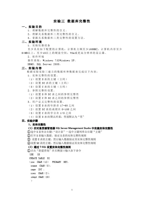 一、实验目的本实验的目的是通过设计和操作数据库,了解数据库的完整性概念,并掌握如何保证数据的完整性。