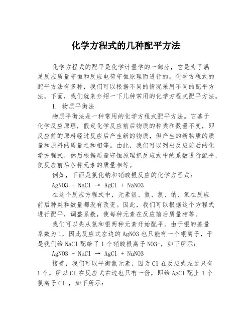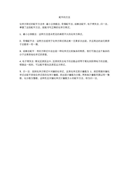 1. 直接配平法:根据化学反应的种类和反应物与生成物之间的化学式,直接调整反应物和生成物的系数,使得反应物的原子数等于生成物的原子数。