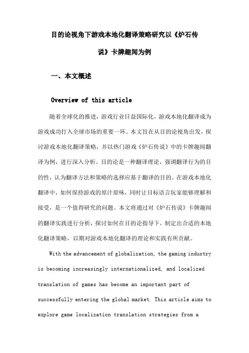 目的论视角下游戏本地化翻译策略研究以《炉石传说》卡牌趣闻为例一、本文概述Overview of this article随着全球化的推进,游戏行业日益国际化,游戏本地化翻译成为游戏成功打入全球市场的重要一环。