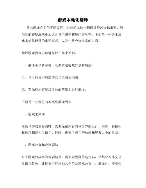 三、译创在游戏本地化翻译中的优势1. 提升用户体验译创可以使游戏本地化翻译更符合目标语言用户的口味和文化背景,提高玩家对游戏的理解和接受度,从而提升用户体验。
