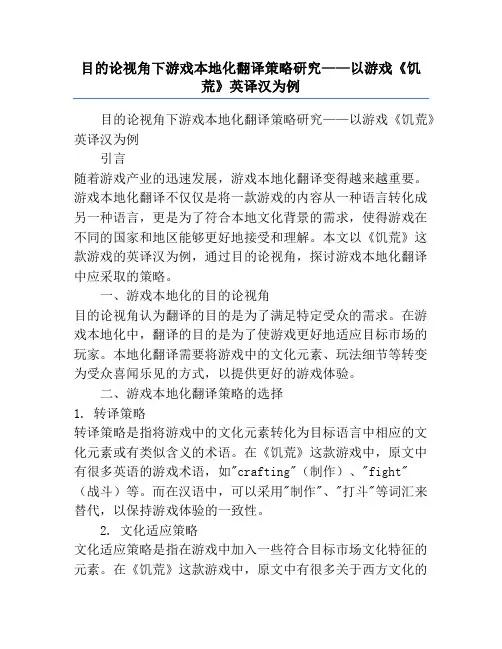 目的论视角下游戏本地化翻译策略研究——以游戏《饥荒》英译汉为例目的论视角下游戏本地化翻译策略研究——以游戏《饥荒》英译汉为例引言随着游戏产业的迅速发展,游戏本地化翻译变得越来越重要。