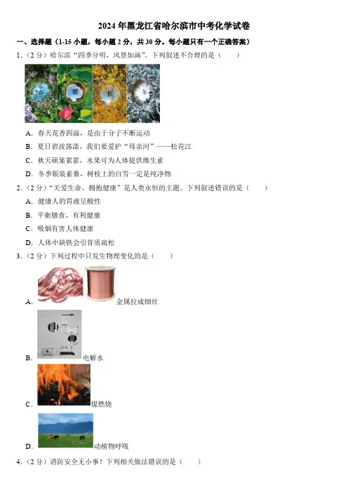 2024年黑龙江省哈尔滨市中考化学试卷一、选择题(1-15小题,每小题2分,共30分。