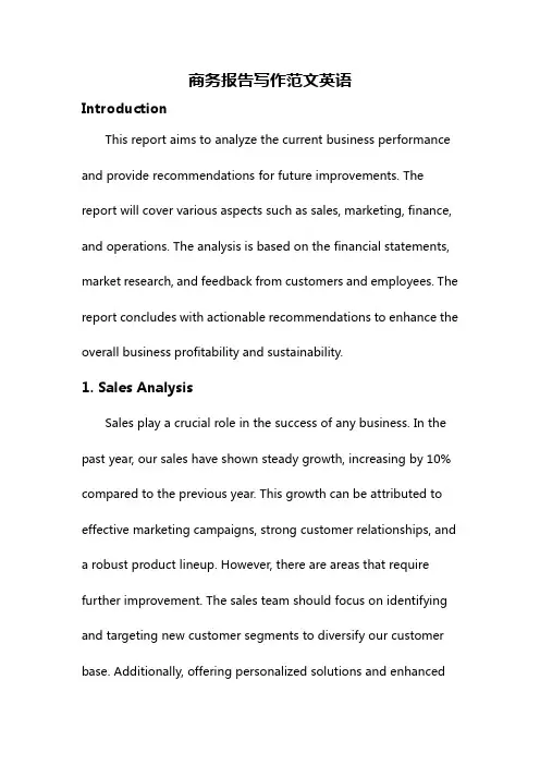 商务报告写作范文英语IntroductionThis report aims to analyze the current business performance and provide recommendations for future improvements. The report will cover various aspects such as sales, marketing, finance, and operations. The analysis is based on the financial statements, market research, and feedback from customers and employees. The report concludes with actionable recommendations to enhance the overall business profitability and sustainability.1. Sales AnalysisSales play a crucial role in the success of any business. In the past year, our sales have shown steady growth, increasing by 10% compared to the previous year. This growth can be attributed to effective marketing campaigns, strong customer relationships, and a robust product lineup. However, there are areas that require further improvement. The sales team should focus on identifying and targeting new customer segments to diversify our customer base. Additionally, offering personalized solutions and enhancedafter-sales support can help foster long-term customer loyalty. 2. Marketing AnalysisMarketing is essential for creating brand awareness, driving sales, and expanding our market reach. In the past year, our marketing efforts have been largely effective, evidenced by the increase in sales. However, the analysis reveals that our online marketing strategies could be further developed. Increasing our digital presence through social media, search engine optimization, and targeted online advertising can help reach a broader audience. Furthermore, customer surveys indicate a need for more engaging and informative content on our website and social media platforms.3. Financial AnalysisA thorough financial analysis is crucial to ensure the financial stability and growth of the business. The financial statements reveal that our cash flow has been well-managed, allowing us to invest in new product development and marketing initiatives. However, the analysis also highlights a need to control operating expenses tomaintain profitability. Implementing cost-saving measures, negotiating better supplier contracts, and optimizing inventory management can help reduce costs and improve the overall financial performance.4. Operations AnalysisEfficient operations are essential for delivering quality products and services effectively. The analysis shows that our current manufacturing process is efficient, enabling us to meet customer demand without delays. However, customer feedback indicates a need for faster order processing and improved product packaging. Upgrading our order management system and investing in higher quality packaging materials can address these concerns and enhance overall customer satisfaction.ConclusionIn conclusion, this report has provided a comprehensive analysis of the business performance, covering sales, marketing, finance, and operations. While the business has seen growth in sales and effective marketing efforts, there are areas that requireattention to further improve overall performance. The recommendations include targeting new customer segments, expanding digital marketing strategies, controlling operating expenses, and investing in order management system and packaging improvements. By implementing these recommendations, we can enhance the profitability and sustainability of our business.Please note that this is just a sample business report writing, and the content and format may vary depending on the specific requirements of your report.。