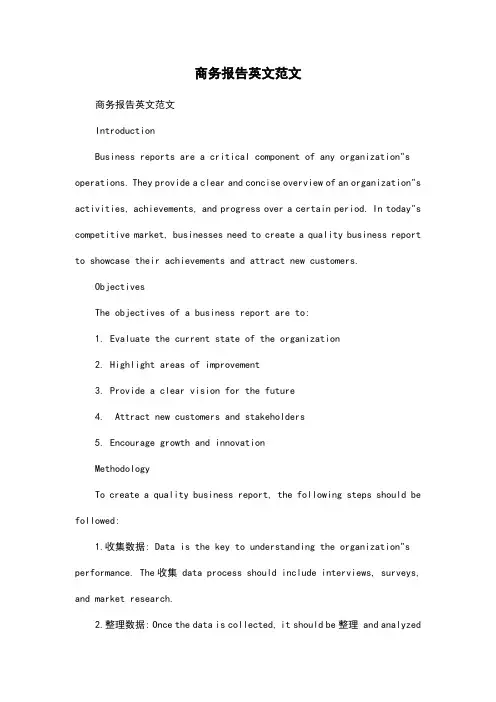 商务报告英文范文商务报告英文范文IntroductionBusiness reports are a critical component of any organization"s operations. They provide a clear and concise overview of an organization"s activities, achievements, and progress over a certain period. In today"s competitive market, businesses need to create a quality business report to showcase their achievements and attract new customers.ObjectivesThe objectives of a business report are to:1. Evaluate the current state of the organization2. Highlight areas of improvement3. Provide a clear vision for the future4. Attract new customers and stakeholders5. Encourage growth and innovationMethodologyTo create a quality business report, the following steps should be followed:1.收集数据: Data is the key to understanding the organization"s performance. The收集 data process should include interviews, surveys, and market research.2.整理数据: Once the data is collected, it should be整理 and analyzedto identify the main findings and trends.3.撰写报告: The report should be written in a clear and concise manner to provide a clear understanding of the organization"s performance. It should also be written in a way that encourages action and growth.4.编辑和校对: The report should be revised and修正ed based on feedback from the team members and stakeholders.ExampleHere is an example of a business report:Title: Report on Our Recent ActivitiesIntroduction:In this report, we will discuss our recent activities and achievements. We will also identify areas of improvement and provide a clear vision for the future.Objectives:1. Evaluate the current state of the organization2. Highlight areas of improvement3. Provide a clear vision for the future4. Encourage growth and innovationMethodology:We conducted a survey among our team members to gather their feedback on our recent activities. We also analyzed market research data to identify areas where we can improve. We also discussed our future planswith our stakeholders.Results:The results of our survey and market research data show that our team members feel that we have made significant progress in recent months. We also identified areas where we can improve in order to achieve our objectives. We also discussed our future plans with our stakeholders and agreed on a clear vision for the future.Conclusion:In conclusion, we believe that our recent activities and achievements have been positive. We also believe that we can improve in the future to achieve our objectives. We will continue to monitor the market and make adjustments as needed. We hope that this report will encourage new customers and stakeholders to consider our services.。