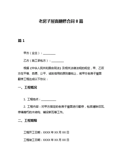 老房子屋面翻修合同6篇篇1甲方(业主):____________________乙方(施工方):__________________鉴于甲方拥有一处老房子需要进行屋面翻修工程,乙方具备相应的施工资质和能力,现甲、乙双方在平等、自愿、公平、诚信的基础上,根据《中华人民共和国合同法》及相关法律法规的规定,就老房子屋面翻修工程达成如下协议:一、工程概述(一)工程名称:老房子屋面翻修工程。