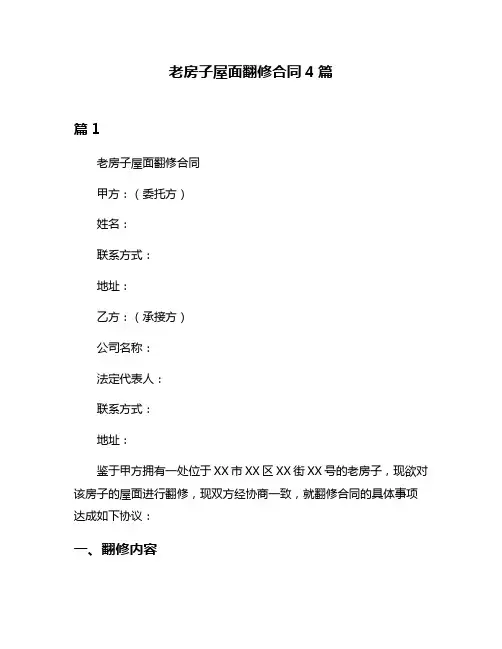 老房子屋面翻修合同4篇篇1老房子屋面翻修合同合同编号:XXXXX甲方:业主姓名乙方:装修公司名称鉴于甲方拥有位于XX市XX区XX街XX号的房产,现欲对该房产的屋面进行翻修,为确保翻修过程中双方权益,甲乙双方达成以下协议:一、工程内容1. 乙方将对甲方房产屋面进行全面检查,制定翻修方案,包括但不限于屋面防水、保温、装饰等工程内容。