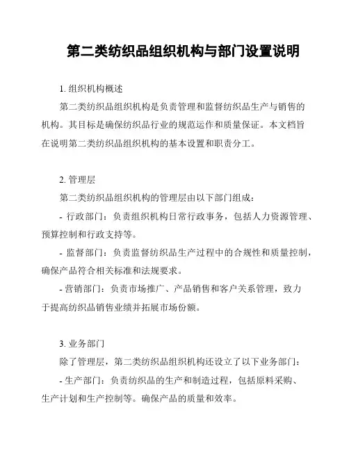 第二类纺织品组织机构与部门设置说明1. 组织机构概述第二类纺织品组织机构是负责管理和监督纺织品生产与销售的机构。