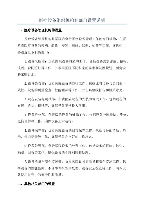 医疗设备组织机构和部门设置说明一、医疗设备管理机构的设置医疗设备管理机构是医院内负责医疗设备管理工作的专门机构,主要负责医疗设备的采购、验收、安装、维修、保养、处置等工作。