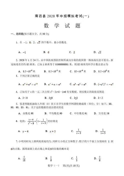 南召县2020年中招模拟考试(一)数 学 试 题一、选择题(每小题3分,共30分)1、在,,,四个数中,最小的数是A .B .C .D .2、2020年1月24日,由中国疾病预防控制所成功分离的我国第一株病毒信息可看出,新冠病毒直径约85纳米,已知1纳米等于0.000000001米,则85纳米用科学计数法表示为A .9105.8-⨯米B .8105.8-⨯米C .91085-⨯米D .9105.8⨯米 3、下列计算正确的是 A .B .C .D .4、已知关于x 的一元二次方程x 2-2x +k -1=0有实数根,则实数k 的取值范围是 A .k <0B .k ≤0C .k ≤2D .k <25、张老师随机抽取九年级(3)班5名学生的数学网课检测成绩(单位:分)如下:80,98,98,83,91,关于这组数据的说法错误的是A .众数是98B .平均数是90C .中位数是91D .方差是566、化简:⎪⎭⎫⎝⎛--÷--311942x x x 的结果是A .B .C .31-x D .31+x 7、小明同时向上掷两枚质地均匀、同样大小的正方体骰子,骰子的六个面上分别刻有 到 的点数,掷得面朝上的点数之和是的倍数的概率是A .185B .61 C .31 D .658、如图,是由若干个完全相同的小正方体组成的一个几何体的主视图和左视图,则组成这个几何体的小正方体的个数是A .个或个或个B .个或个C .个或个D .个或个9、如图,在平面直角坐标系中,以为圆心,适当长为半径画弧,交轴于点,交轴于点,再分别以点、为圆心,大于MN 21的长为半径画弧,两弧在第二象限交于点.若点的坐标为 ,则与的数量关系为A .B .C .D .10、如图,等边△ABC 的顶点A (1,1),B (3,1),规定把△ABC “先沿x 轴翻折,再向左平移1个单位”为一次变换,这样连续经过2020次变换后,等边△ABC 的顶点C 的坐标为A .(-2 020,31+)B .(-2 019,31--)C .(-2 018,31+)D .(-2 017,31--)二、填空题(每小题3分;共15分)11、计算:()12120--=____________.12、如图,等腰直角三角板的顶点,分别在直线,上.若b a //,∠2=10°,则1= 度.CB A Oxy13、已知一次函数b x y +-=2的图象过点,.若,则.14、如图,是半圆的直径,且,点为半圆上的一点.将此半圆沿所在的直线折叠,若圆弧恰好过圆心,则图中阴影部分的面积是 (结果保留π).15、如图,已知Rt △ABC 中,∠B =90°,∠A =60°,AB =3,点M ,N 分别在线段AC ,AB 上,将△ANM 沿直线MN 折叠,使点A 的对应点D 恰好落在线段BC 上,若△DCM 为直角三角形时,则AM 的长为__________.第12题图 第14题图 第15题图 三、解答题(8+9+9+9+9+10+10+11=75分)16、(8分)先化简,再求值:4x (x -1)-(2x -1)2+3x ,其中x 是不等式组32123x x x x >-⎧⎪+⎨>⎪⎩的整数解.17、家庭过期药品属于“危险废物”,处理不当将污染环境.某市药监部门为了了解市民家庭处理过期药品的方式,决定对全市家庭做一次简单随机抽样调查.(1)下列选取样本的方法最合理的一种是____________.(只需填上正确答案的序号) ①在市中心某个居民区以家庭为单位随机抽取; ②在全市医务工作者中以家庭为单位随机抽取; ③在全市常住人口中以家庭为单位随机抽取.经抽样调查发现,接受调查的家庭都有过期药品,现将有关数据呈现如图:ABCDMNF EDCBA处理方式户数805102006050100200300400500010%m %n %5%8%51%A B CD E F A :B :C :D :E :F :继续使用直接丢弃送回收点搁置家中卖给药贩直接焚烧(2)填空:m =______,n =_____; (3)补全条形统计图;(4)该市市民家庭处理过期药品最常见的方式是 。