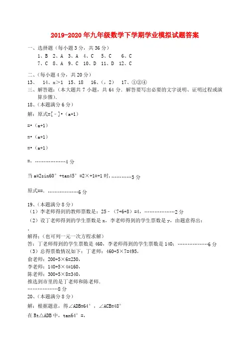 2019-2020年九年级数学下学期学业模拟试题答案一、选择题(每小题3分,共36分)1、B2、A3、A4、C5、C6、C7、C 8、A 9、C 10、D 11、D 12、C二、(每小题4分,共20分)13、 14、x>115、18 16、(,2) 17、①②④三、解答题:(本大题共7小题,共64分.解答要写出必要的文字说明、证明过程或演算步骤).18、(本题满分6分)解:原式=[﹣]•(a+1)=•(a+1)=•(a+1)=•(a+1)=,………………4分当a=2sin60°+tan45°=2×+1=+1时,…………5分原式==.………………6分19、(本题满分8分)(1)李老师得到的教师票数是:25﹣(7+6+8)=4,………………2分(2)设丁老师得到的学生票数是x,李老师得到的学生票数是y,由题意得出:,解得;(也可列一元一次方程求解)答:丁老师得到的学生票数是460,李老师得到的学生票数是140;………………6分(3)总得票数情况如下:丁老师:460+5×7=495,俞老师:200+5×6=230,李老师:140+5×4=160,陈老师:300+5×8=340,推选到市里的是丁老师和陈老师.………………8分20、(本题满分8分)解:根据题意,得∠ADB=64°,∠ACB=48°在Rt△ADB中,tan64°=,则BD=≈AB,………………2分在Rt△ACB中,tan48°=,则CB=≈AB,………………4分∴CD=BC﹣BD即6=AB﹣AB解得:AB=≈14.7(米),………………7分∴建筑物的高度约为14.7米.………………8分21、(本题满分10分)解:(1)∵AB=5﹣2=3cm,OB=2cm,∴A的坐标是(2,3),代入y=得3=,解得:k=6;………………3分(2)OD=2+2=4,在y=中令x=4,解得y=.则C的坐标是(4,).设AC的解析式是y=mx+n,根据题意得:,解得:,则直线AC的解析式是y=﹣x+;………………6分(3)直角△AOB中,OB=2,AB=3,则S△AOB=OB•AB=×2×3=3;直角△ODC中,OD=4,CD=,则S△OCD=OD•CD=×4×=3.在直角梯形ABDC中,BD=2,AB=3,CD=,则S梯形ABDC=(AB+DC)•BD=(3+)×2=.则S△OAC=S△AOB+S梯形ABDC﹣S△OCD=3+﹣3=.………………10分22. (本题满分10分)(1)证明:连接OD,与AF相交于点G,………………1分∵CE与⊙O相切于点D,∴OD⊥CE,………………2分∴∠CDO=90°,∵AD∥OC,∴∠ADO=∠DOC,∠DAO=∠BOC,∵OA=OD,∴∠ADO=∠DAO,∴∠DOC=∠BOC,在△CDO和△CBO中,,∴△CDO≌△CBO,∴∠CBO=∠CDO=90°,∴CB是⊙O的切线.………………5分(2)由(1)可知∠DOA=∠BCO,∠DOC=∠BOC,∵∠ECB=60°,∴∠DCO=∠BCO=∠ECB=30°,∴∠DOC=∠BOC=60°,∴∠DOA=60°,∵OA=OD,∴△OAD是等边三角形,∴AD=OD=OF,∵∠GOF=∠ADO,在△ADG和△FOG中,,∴△ADG≌△FOG,∴S△ADG=S△FOG,∵AB=6,∴⊙O的半径r=3,∴S阴=S扇形ODF==π.………………10分23、(本题满分10分)解:(1)四边形ABCD是垂美四边形.证明:∵AB=AD,∴点A在线段BD的垂直平分线上,∵CB=CD,∴点C在线段BD的垂直平分线上,∴直线AC是线段BD的垂直平分线,∴AC⊥BD,即四边形ABCD是垂美四边形;………………3分(2)猜想结论:垂美四边形的两组对边的平方和相等.………………4分如图2,已知四边形ABCD中,AC⊥BD,垂足为E,求证:AD2+BC2=AB2+CD2证明:∵AC⊥BD,∴∠AED=∠AEB=∠BEC=∠CED=90°,由勾股定理得,AD2+BC2=AE2+DE2+BE2+CE2,AB2+CD2=AE2+BE2+CE2+DE2,∴AD2+BC2=AB2+CD2;………………6分(3)连接CG、BE,∵∠CAG=∠BAE=90°,∴∠CAG+∠BAC=∠BAE+∠BAC,即∠GAB=∠CAE,在△GAB和△CAE中,,∴△GAB≌△CAE,∴∠ABG=∠AEC,又∠AEC+∠AME=90°,∴∠ABG+∠AME=90°,即CE⊥BG,∴四边形CGEB是垂美四边形,由(2)得,CG2+BE2=CB2+GE2,∵AC=4,AB=5,∴BC=3,CG=4,BE=5,∴GE2=CG2+BE2﹣CB2=73,∴GE=.………………10分24、(本题满分12分)解:(1)当y=0时,﹣3x﹣3=0,x=﹣1∴A(﹣1,0)当x=0时,y=﹣3,∴C(0,﹣3),∴∴,抛物线的解析式是:y=x2﹣2x﹣3.………………3分当y=0时,x2﹣2x﹣3=0,解得:x1=﹣1,x2=3∴B(3,0).………………4分(2)由(1)知B(3,0),C(0,﹣3)直线BC的解析式是:y=x﹣3,设M(x,x﹣3)(0≤x≤3),则E(x,x2﹣2x﹣3)∴ME=(x﹣3)﹣(x2﹣2x﹣3)=﹣x2+3x=﹣(x﹣)2+;∴当x=时,ME的最大值为.………………8分(3)答:不存在.………………9分理由如下:由(2)知ME取最大值时ME=,E(,﹣),M(,﹣)∴MF=,BF=OB﹣OF=.设在抛物线x轴下方存在点P,使以P、M、F、B为顶点的四边形是平行四边形,则BP∥MF,BF∥PM.∴P1(0,﹣)或P2(3,﹣)当P1(0,﹣)时,由(1)知y=x2﹣2x﹣3=﹣3≠﹣∴P1不在抛物线上.当P2(3,﹣)时,由(1)知y=x2﹣2x﹣3=0≠﹣∴P2不在抛物线上.综上所述:在x轴下方抛物线上不存在点P,使以P、M、F、B为顶点的四边形是平行四边形.………………12分评卷说明:1.选择题和填空题中的每小题,只有满分和零分两个评分档,不给中间分.2.解答题每小题的解答中所对应的分数,是指考生正确解答到该步骤所应得的累计分数.本答案对每小题只给出一种或两种解法,对考生的其他解法,请参照评分意见进行评分.3.如果考生在解答的中间过程出现计算错误,但并没有改变试题的实质和难度,其后续部分酌情给分,但最多不超过正确解答分数的一半;若出现严重的逻辑错误,后续部分就不再给分.。