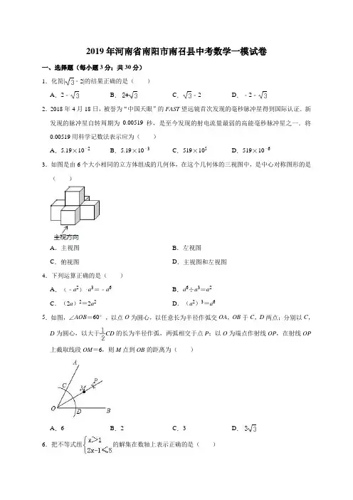 2019年河南省南阳市南召县中考数学一模试卷一、选择题(每小题3分;共30分)1.化简|﹣2|的结果正确的是()A.2﹣B.C.﹣2D.﹣2﹣2.2018年4月18日,被誉为“中国天眼”的FAST望远镜首次发现的毫秒脉冲星得到国际认证.新发现的脉冲星自转周期为0.00519秒,是至今发现的射电流量最弱的高能毫秒脉冲星之一.将0.00519用科学记数法表示应为()A.5.19×10﹣2B.5.19×10﹣3C.519×105D.519×10﹣63.如图是由6个大小相同的立方体组成的几何体,在这个几何体的三视图中,是中心对称图形的是()A.主视图B.左视图C.俯视图D.主视图和左视图4.下列运算正确的是()A.(﹣a2)⋅a3=﹣a6B.a6÷a3=a2C.(2a)2=2a2D.(a2)3=a65.如图,∠AOB=60°,以点O为圆心,以任意长为半径作弧交OA,OB于C,D两点;分别以C,D为圆心,以大于CD的长为半径作弧,两弧相交于点P;以O为端点作射线OP,在射线OP 上截取线段OM=6,则M点到OB的距离为()A.6B.2C.3D.6.把不等式组的解集在数轴上表示正确的是()A.B.C.D.7.我国古代数学著作《增删算法统宗》记载”绳索量竿”问题:“一条竿子一条索,索比竿子长一托.折回索子却量竿,却比竿子短一托.“其大意为:现有一根竿和一条绳索,用绳索去量竿,绳索比竿长5尺;如果将绳索对半折后再去量竿,就比竿短5尺.设绳索长x尺,竿长y尺,则符合题意的方程组是()A.B.C.D.8.某校男子足球队的年龄分布如图所示,则根据图中信息可知这些队员年龄的平均数,中位数分别是()A.15.5,15.5B.15.5,15C.15,15.5D.15,159.小英同时掷甲、乙两枚质地均匀的小立方体(立方体的每个面上分别标有数字1,2,3,4,5,6).记甲立方体朝上一面上的数字为x、乙立方体朝上一面朝上的数字为y,这样就确定点P的一个坐标(x,y),那么点P落在双曲线上的概率为()A.B.C.D.10.如图,在平面直角坐标系中,函数y=2x和y=﹣x的图象分别为直线l1,l2,过点(1,0)作x 轴的垂线交l1于点A1,过点A1作y轴的垂线交l2于点A2,过点A2作x轴的垂线交l1于点A3,过点A3作y轴的垂线交l2于点A4,…,依次进行下去,则点A2019的坐标为()A.(21009,21010)B.(﹣21009,21010)C.(21009,﹣21010)D.(﹣21009,﹣21010)二、填空题(每小题3分;共15分)11.计算:(﹣1)0﹣(﹣)﹣2=.12.若关于x的一元二次方程x2﹣2x+a﹣1=0有实数根,则a的取值范围是.13.如图,抛物线y=ax2+bx+c(a>0)的对称轴是过点(1,0)且平行于y轴的直线,若点P(4,0)在该抛物线上,则4a﹣2b+c的值为.14.如图,AC⊥BC,AC=BC=2,以BC为直径作半圆,圆心为O,以点C为圆心,BC为半径作弧AB,过点O作AC的平行线交两弧于点D、E,则阴影部分的面积是.15.如图,在菱形ABCD中,∠DAB=45°,AB=4,点P为线段AB上一动点,过点P作PE⊥AB 交AD于点E,沿PE将∠A折叠,点A的对称点为点F,连接EF、DF、CF,当△CDF为等腰三角形时,AP的长为.三、解答题(8+9+9+9+9+10+10+11=75分)16.先化简,再求值:,其中x满足x2﹣x﹣1=0.17.某校学生会发现同学们就餐时剩余饭菜较多,浪费严重,于是准备在校内倡导“光盘行动”,让同学们珍惜粮食,为了让同学们理解这次活动的重要性,校学生会在某天午餐后,随机调查了部分同学这餐饭菜的剩余情况,并将结果统计后绘制成了如图所示的不完整的统计图.(1)这次被调查的同学共有人;(2)补全条形统计图,并在图上标明相应的数据;(3)扇形统计图中圆心角α=度;(4)校学生会通过数据分析,估计这次被调查的所有学生一餐浪费的食物可以供50人食用一餐.据此估算,该校18000名学生一餐浪费的食物可供多少人食用一餐.18.某游客计划测量这座塑像的高度,(如图1),由于游客无法直接到达塑像底部,因此该游客计划借助坡面高度来测量塑像的高度;如图2,在塑像旁山坡坡脚A处测得塑像头顶C的仰角为75°,当从A处沿坡面行走10米到达P处时,测得塑像头顶C的仰角刚好为45°,已知山坡的坡度i=1:3,且O,A,B在同一直线上,求塑像的高度.(侧倾器高度忽略不计,结果精确到0.1米,参考数据:cos75°≈0.3,tan75°≈3.7,,,)19.如图,已知△ABC内接于⊙O,AB是直径,OD⊥BC于点D,延长DO交⊙O于F,连接OC,AF.(1)求证:△COD≌△BOD;(2)填空:①当∠1=时,四边形OCAF是菱形;②当∠1=时,AB=2OD.20.如图,直线y=mx与反比例函数(x>0)的图象交于Q点,点B(3,4)在反比例函数的图象上,过点B作PB∥x轴交OQ于点P,过点P作PA∥y轴交反比例函数图象于点A.(1)若点A的纵坐标为,求反比例函数及直线OP的解析式;(2)连接OB,在(1)的条件下,求sin∠BOP的值.21.某科技公司研发出一款多型号的智能手表,一家代理商出售该公司的A型智能手表,去年销售总额为80000元,今年A型智能手表的售价每只比去年降了600元,若售出的数量与去年相同,销售总额将比去年减少25%.(1)请问今年A型智能手表每只售价多少元?(2)今年这家代理商准备新进一批A型智能手表和B型智能手表共100只,它们的进货价与销售价格如右表,若B型智能手表进货量不超过A型智能手表数量的3倍,所进智能手表可全部售完,请你设计出进货方案,使这批智能手表获利最多,并求出最大利润是多少元?22.如图(1),两个等腰直角三角形ABC和DEF有一条边在同一条直线l上,DE=2,AB=1.将直线EB绕点E逆时针旋转45°,交直线AD于点M.将图(1)中的△ABC沿直线l向右平移,设C、E两点间的距离为k.请解答下列问题:(1)①当点C与点F重合时,如图(2)所示,此时的值为.②在平移过程中,的值为(用含k的代数式表示).(2)将图(2)中的△ABC绕点C逆时针旋转,使点A落在线段DF上,如图(3)所示,将直线EB绕点E逆时针旋转45°,交直线AD于点M,请补全图形,并计算的值.(3)将图(1)中的△ABC绕点C逆时针旋转α(0°<α≤45°),将直线EB绕点E逆时针旋转45°,交直线AD于