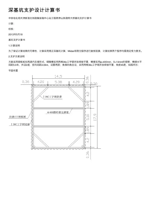 深基坑⽀护设计计算书中铁电化局天津新港北铁路集装箱中⼼站⼯程跨津⼭铁路特⼤桥基坑⽀护计算书计算:校核:2013年5⽉18基坑⽀护计算书1.计算说明为了保证计算结果的可靠性,计算采⽤理正深基坑计算,Midas有限元程序进⾏复核验算,计算结果两个程序均需满⾜受⼒要求。