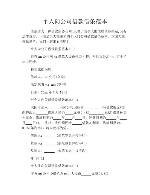 借款人(签字):________年____月____日个人向公司借条(六)借条甲方:(借款人姓名、身份证号码、联系电话)乙方:(被借款人/出借人姓名、身份证号码、联系电话)根据《中华人民共和国合同法》的相关规定,甲、乙双方在平等自愿的基础上,经协商同意签订如下借款协议:一、借款金额甲方向乙方借款人民币(大写:__________元整,小写:人民币__________元)。