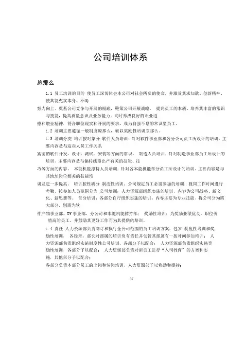 公司培训体系总那么1.1 员工培训的目的使员工深切体会本公司对社会所负的使命,并激发其求知欲、创新精神,使其能充实本身、不竭努力向上,奠基公司竞争与开展的根底,鞭策公司开展战略。