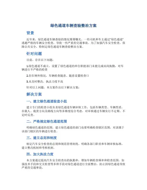 绿通车车辆专项整治方案背景为进一步加强对绿色通道车辆的管理,保障绿色通道正常运行,实现优先通行的目的,加强对绿色通道车辆的日常管理和巡查,规范绿色通道车辆的工作流程,提高绿色通道的管理水平,我们提出了绿通车车辆专项整治方案。