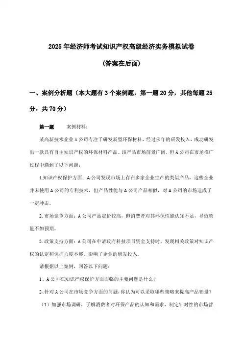2025年经济师考试知识产权高级经济实务模拟试卷(答案在后面)一、案例分析题(本大题有3个案例题,第一题20分,其他每题25分,共70分)第一题案例材料:某高新技术企业A公司专注于研发新型环保材料,经过多年的研发投入,成功研发出一款具有自主知识产权的环保材料产品。