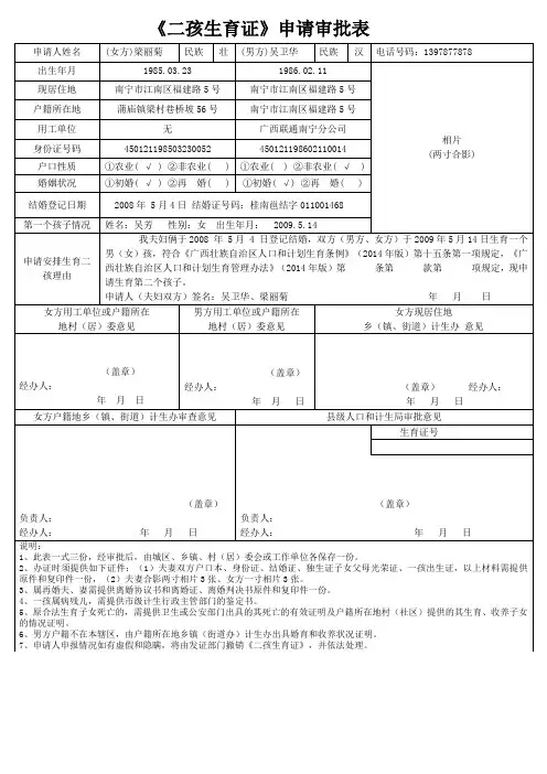 《二孩生育证》申请审批表申请人姓名(女方)梁丽菊 民族 壮 (男方)吴卫华 民族 汉 电话号码:1397877878 出生年月1985.03.23 1986.02.11 相片 (两寸合影) 现居住地南宁市江南区福建路5号 南宁市江南区福建路5号 户籍所在地蒲庙镇梁村巷桥坡56号 南宁市江南区福建路5号 用工单位无 广西联通南宁分公司 身份证号码450121************ 450121************ 户口性质①农业( √ ) ②非农业( ) ①农业( ) ②非农业( √ ) 婚姻状况①初婚( √ ) ②再 婚( ) ①初婚( √) ②再 婚( ) 结婚登记日期 2008年 5月4日 结婚证号码:桂南邕结字011001468第一个孩子情况 姓名:吴芳 性别:女 出生年月: 2009.5.14申请安排生育二孩理由 我夫妇俩于2008 年 5月 4 日登记结婚,双方(男方、女方)于2009年5月14日生育一个男(女)孩,符合《广西壮族自治区人口和计划生育条例》(2014年版)第十五条第一项规定,《广西壮族自治区人口和计划生育管理办法》(2014年版)第 条第 款第 项规定,现申请生育第二个孩子。