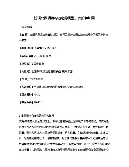 浅谈公路调治构造物的类型、养护和加固王欣;刘剑锋【摘要】介绍桥梁调治构造物类型、作用及养护加固应注意的几个问题及养护技术措施【期刊名称】《黑龙江交通科技》【年(卷),期】2010(033)009【总页数】1页(P134)【关键词】公路;桥梁;调治构造物;类型;养护;加固【作者】王欣;刘剑锋【作者单位】五常市公路管理站;前嫩高速公路建设指挥部【正文语种】中文【中图分类】U445.71 主要调治构造物的类型和作用(1)导流堤是从桥台向河流上、下游延伸,在平面上呈喇叭口形的构造物。
