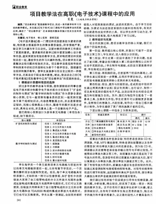 项目教学在《电子技术基础》中的应用【摘要】本文主要探讨在《电子技术基础》教学实践中,运用项目教学法把理论教学与实践教学有机的结合,通过有效的引导,使教学过程体现“教师为主导,学生为主体”的思想。