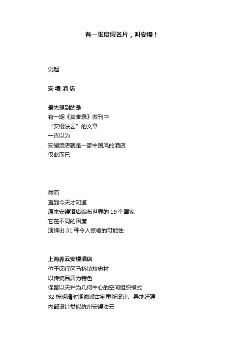 有一张度假名片,叫安缦!说起安缦酒店最先想到的是有一期《集舍录》微刊中“安缦法云”的文章一直以为安缦酒店就是一家中国风的酒店仅此而已然而直到今天才知道原来安缦酒店遍布世界的19个国家它在不同的国度演绎出31种令人惊艳的可能性上海养云安缦酒店位于闵行区马桥镇旗忠村以传统民居为特色保留以天井为几何中心的空间组织模式32栋明清时期徽派古宅重新设计、异地迁建内部设计类似杭州安缦法云室内几乎所有的家具都是木头的床架、茶几、衣橱、椅子、房梁……房间内整体的灯光都比较暗只在必须要用到照明的地方才会使用灯日本安缦温泉度假村酒店远眺享有“珍珠湾”美誉的英虞湾广阔的湾中小岛与珍珠养殖筏零星散布设计沿袭日本古典美学建筑风格24间套房与4套双卧室别墅天然的木质大落地窗引入自然光线与风景简朴自然的东方设计语境打造生活格调极致的细节呈现了日式精致的设计精髓唯美的自然景观让酒店更空灵美绝天堂的四季风光就在窗外多米尼加共和国安缦这里展现的是与原生态自然环境的和谐相融它符合人们对现代生活的审美需求这是第29家安缦酒店也是安缦第一家融入高尔夫元素的度假村从梵语衍生词“和平安宁”中汲取灵感并以水为灵魂开展设计度假村周围的区域原始古老且人烟稀少多种多样的景色在此共襄盛举演绎出一派清闲丽江大研安缦酒店傲居古城中心狮子山顶远山黛空,白云悠悠远可眺望玉龙雪山近可尽览古城风砖瓦结构的屋顶鳞次栉比一墙之隔便是滚滚红尘和避世幽居套房的装饰材料与织品均来自云南地区每间套房都带有庭院或露台家具则由东北地区的榆树制成极具现代感又不乏中国元素东京安缦度假村位于久负盛名的大手町金融区宁静的内部花园安逸的水疗和游泳池无不为这个凌空度假圣地注入画龙点睛之笔东京安缦占据着最新建成的Otemachi Tower顶部六层不仅是东京传统与现代融合的缩影更是一个凌空于都会的避世圣地越南安缦度假村酒店地处东海之边的白沙海滩装饰风格融合了现代婉约与越南传统建筑特色倚荷花池而造的安缦Spa体验中心占据了绝佳远眺国家公园山谷的地理位置这是一个安静的Spa体验中心安缦还提供宾客多种健身选择两座露天网球中心与多条小径可供宾客在此闲庭信步地独享自然美景安缦威尼斯度假村位于享有“水上香榭丽舍”美誉的威尼斯大运河上度假村由两幢相互毗邻的5层楼高的建筑构成酒店房间最大限度地保留了过往艺术与建筑风格的壁画与浮雕大部分套房的客厅与卧室相连接还有独立的更衣室和浴室希腊安缦度假村38间客房按阶梯式交错排列最大限度地为宾客保留其私密空间同时也可从不同角度来欣赏爱琴海美景每座独立的建筑前均有石墙庭院穿过庭院便可到达宽敞舒适的起居休息区域进入休息区域即可见到挑高的天花板卧室的床嵌入于大理石墙之中这样起居室便与盥洗室融于一体与天台相连,蔽于藤架之下爱琴海安缦度假村被地中海松树林和古老的橄榄树园包围可以看到绝妙的海景酒店受当地传统建筑结构和建造风格影响拥有各式的庭院房和露台房宽敞的空间感和奢华感营造出私密的个人空间设计师充分尊重了周围的原始自然环境融入了地中海元素和土耳其元素家具、门窗是用深色的原木打造而成墙面的装饰是由石头手刻而成印度安缦酒店帐篷与荒野的神奇结合这个趋势是在荒野自然之中用顶尖的环保、切近自然的设计提供客人以“浸入”式体验晚上在这里喝着香槟听着野生小动物穿行于灌木丛林的声音此起彼伏的大自然声乐犹如天籁之音没有任何的修饰如此的干静和纯朴心灵回归宁静杭州法云安缦酒店因为隐于山谷密林间整日与梵音相伴也成了西湖畔极好的清修之地47处房舍原样保留了古村昔日的样貌没有喧宾夺主的美貌只有源于自然的优雅及对历史的敬重法云径亦连接着灵隐景区内的千年宝刹灵隐寺房客若是想朝香便可通过该小径来往于两寺之间而有时也会有修行人身着佛袍踱步在小径之上合着眼前的风景,正是恰如其分的淡雅犹他州峡谷沙漠安缦酒店在美国西南部壮丽的峡谷风景之中泳池围绕一块巨石而建绝壁与碧水辉映从私人庭院进入套房房间设计简约而惬意白色的石砌地板和水泥墙面效仿周围天然岩石浅色坐垫和柔暖盖毯平添几分温馨老挝安缦度假村保留了法式殖民风格并融入老挝当地传统建筑样式酒店所在建筑被联合国教科文组织列为世界上现存的罕为人知却又保护完好的历史遗产之一所有客房均为开放式设计阳光从法式百叶窗的缝隙间撒入房间温和而浪漫黑山安缦度假村位于黑山共和国亚得里亚海岸中心地带小岛的修复工作耗时长但细致入微力求保持小岛的历史气息精心保护起那些坚固的石建筑群它们的红色屋瓦在一片寒冬的常青树丛中显得欢乐祥和内部装饰则根据现代需求做了修复和翻新颐和安缦度假村走出颐和园东门它就隐藏在民居院落之中其中一些院落拥有上百年的历史这些院落最初供颐和园的贵客居住方便他们在此恭候慈禧太后的銮驾度假村采用传统中式设计融合了现代的舒适感受和古典的装饰风格不丹安缦度假村在这里可以游览原始的喜玛拉雅风光领略那穿越了几个世纪的古老文化、社会和精神传统度假村的别墅群形成了静谧王国中的独特环路这是第