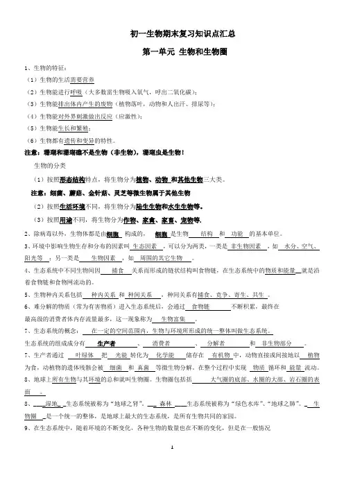 初一生物期末复习知识点汇总第一单元生物和生物圈1、生物的特征:(1)生物的生活需要营养(2)生物能进行呼吸(大多数需生物吸入氧气,呼出二氧化碳);(3)生物能排出体内产生的废物(植物落叶,动物和人出汗、排尿等);(4)生物能对外界刺激做出反应(应激性);(5)生物能生长和繁殖;(6)生物都有遗传和变异的特性。