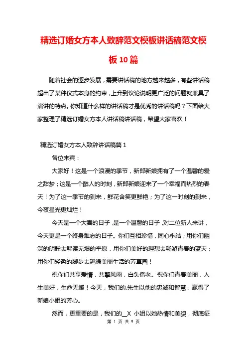 订婚仪式女方讲话稿十篇订婚仪式女方讲话稿十篇订婚仪式女方讲话稿篇1各位亲朋好友:感谢各位在百忙中抽空参加小女的婚礼,为他们婚姻做出神圣的见证。