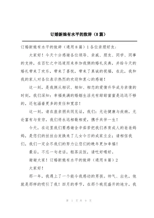 有关新娘在订婚宴上的发言稿例文五篇新人们在订婚宴的日子时,想必是有许多心里话想要同大家倾诉的,但是一时间想法太多可能无法理清思绪,为了帮助大家解决这个烦恼,橙子在此献上五篇有关新娘在订婚宴上的发言稿例文,希望对大家有所帮助。